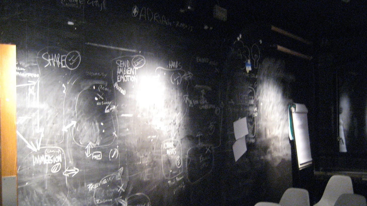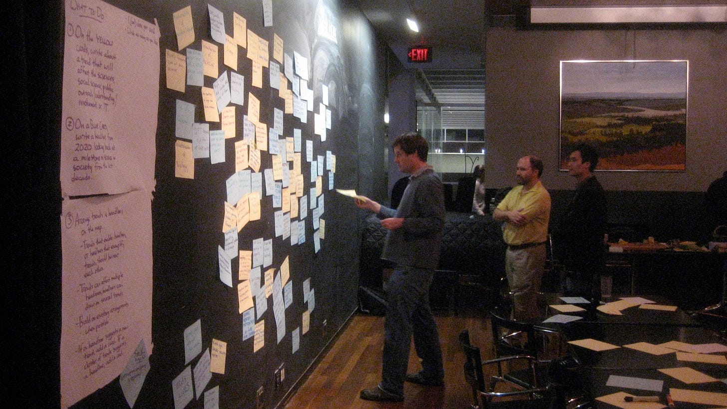 Scenario planning workshops involving corporate groups— product developers, strategists, executives, etc.— are often organized into working sessions that involve brainstorming ideas, writing them on Post-Its, and then putting them on blackboard-sized sheets of paper. Working this way allows groups to easily share ideas, move them around in thought experiments, explore new connections between them and imagine various possible futures: the Post-its become immutable mobiles (to borrow from Bruno Latour), and the big paper becomes a space where participants can store, manipulate, and generate new ideas. They encourage participants to think big.