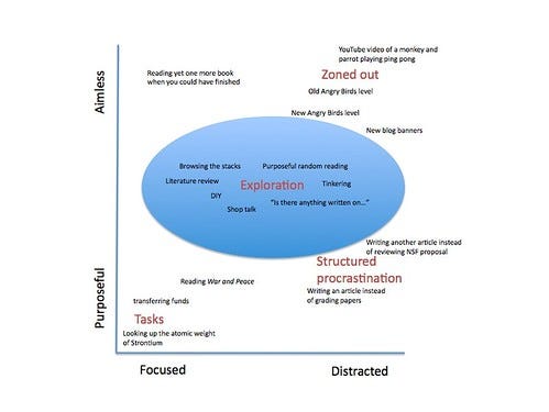 Part of what makes it attractive is not that it's simply a distraction; rather, "it’s sufficiently smart and interesting that spending massive amounts of time on it is totally possible and semi-defensible." It occupies a space somewhere in the "exploration" space of the graphic I described a couple years ago.